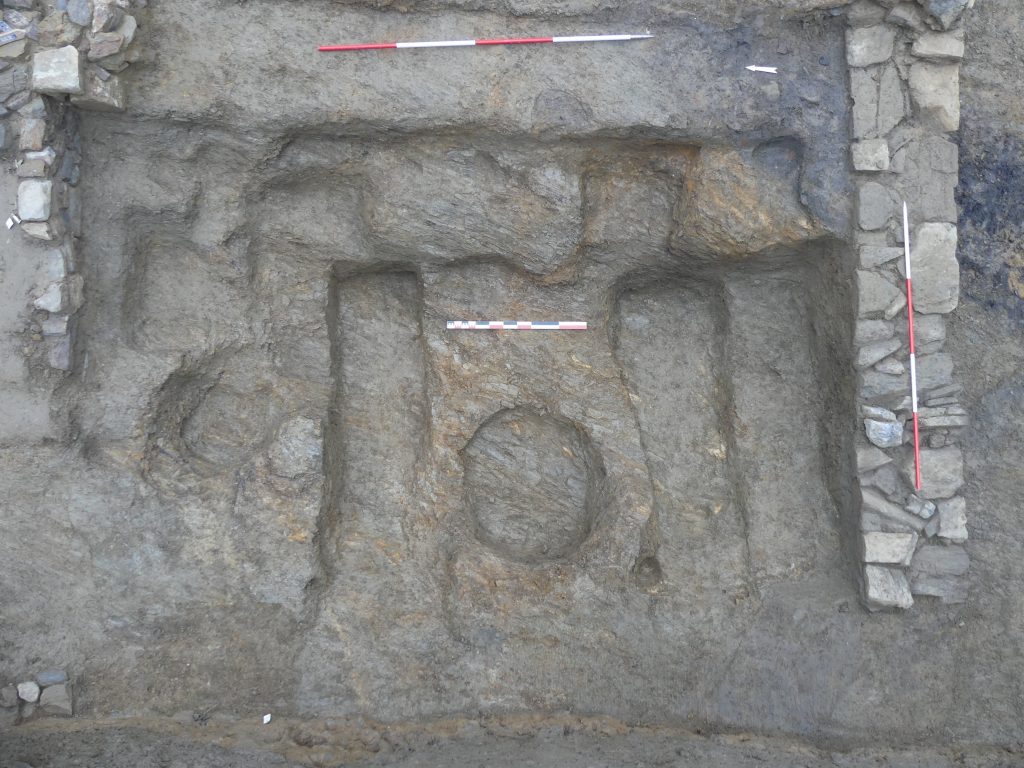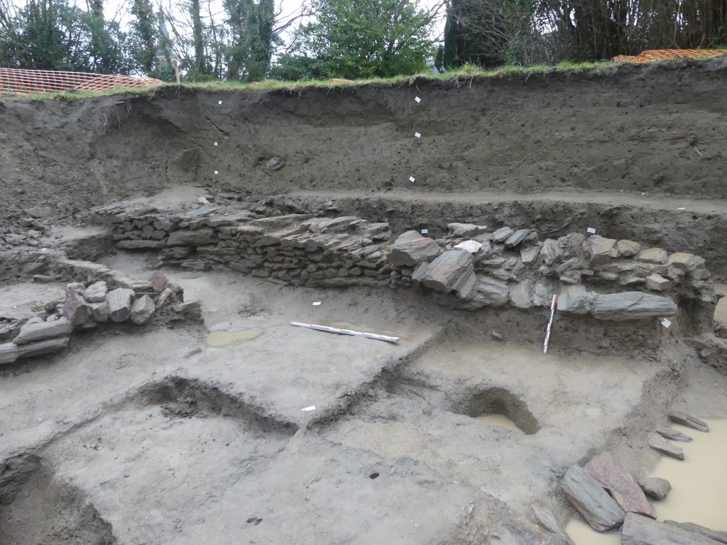 Les installations du Moyen Âge détruisent et effacent presque totalement les vestiges des périodes sous-jacentes. L’installation d’une motte avec basse-cour, implique tout un ensemble de bâtiments, dont les maçonneries au nord-est de l’emprise peuvent en être les vestiges. Elles sont caractérisées par des murs bahut dans lesquels s’observent les emplacements des poteaux. De même, d’imposantes fosses pour poteaux plantés et des structures à vocation artisanale ou de stockage ont pu fonctionner avec ces bâtiments. La relation chronologique de cet ensemble complexe sera qualifiée en post-fouille, mais il en ressort déjà une organisation structurelle faisant écho à d’autres basses-cours fouillées dans d’autres régions, en Normandie, notamment.