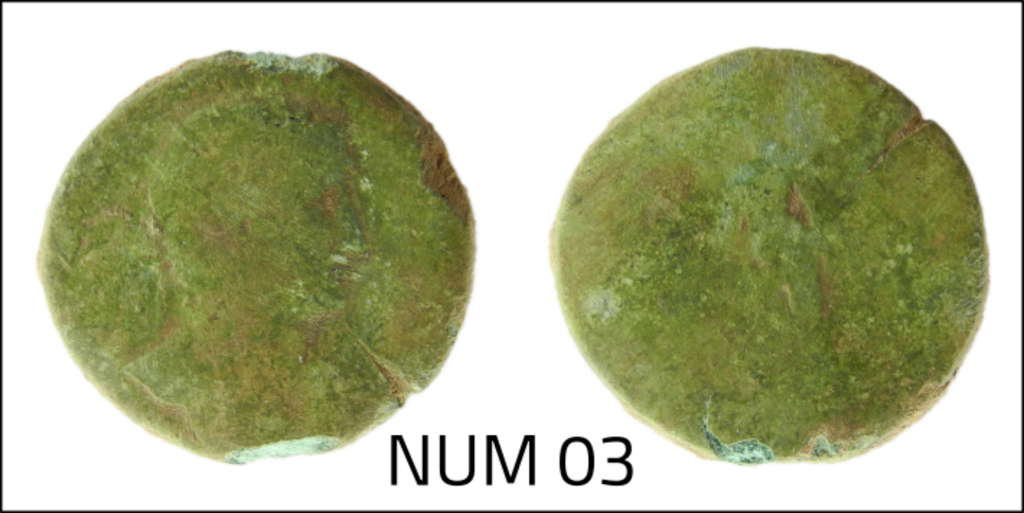 Fig. 2 : Monnaie « as » en bronze usé, émis sous Hadrien (117-138), mis au jour dans les colluvions.
