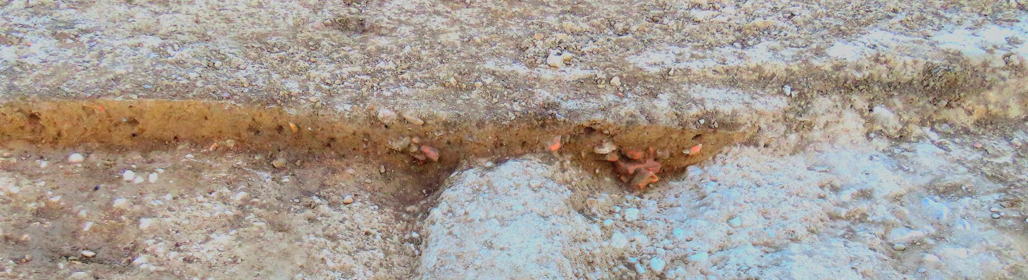Fig. 4 : Portion d’un chemin creux marqué par deux ornières comblées par des Terres Cuites Architecturales. Crédit : Éveha, 2025.