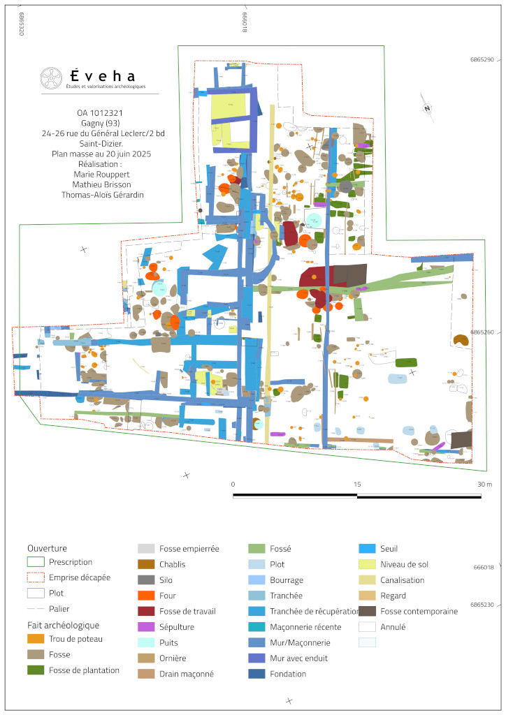 Les fouilles archéologiques menées sur le site de GAGNY (93) – 24-26 Rue du Général Leclerc/2 bd Saint Dizier ont été réalisées par le bureau d’études Éveha sous la responsabilité de Thomas-Aloïs Gérardin dans le cadre du projet d’aménagement porté par Sedelka. Les investigations archéologiques ont permis de mettre au jour des vestiges allant du Moyen Âge à l’Époque contemporaine.