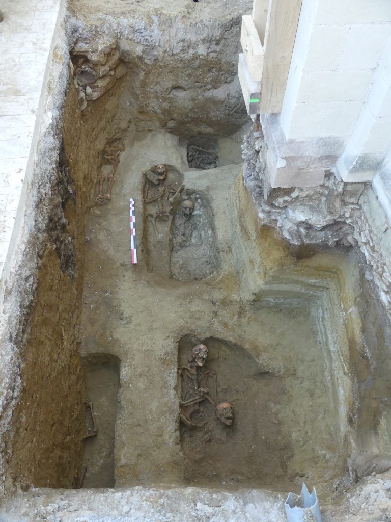 L’occupation funéraire prend place dans un second temps tout autour de l’église avec des faciès bien distincts selon leur localisation. Au nord, certaines tombes sont architecturées de coffrages en pierre, tandis que ce type d’inhumation n’a pas été rencontré par ailleurs. La zone est également la seule où ont été découvertes des céramiques associées aux corps. Les individus fouillés au sud de la nef, à l’endroit du cloître, présentent pour leur part la particularité d’être profondément enterrés. La découverte d’épingles de linceuls et plusieurs fragments de chapelets associés aux corps témoignent de pratiques particulières pour cet ensemble d’une quinzaine de sépultures. Il est certainement question ici de sépultures de religieux ou religieuses. Aucun trait particulier n’est en revanche à mettre en lumière pour le reste des inhumations étudiées.