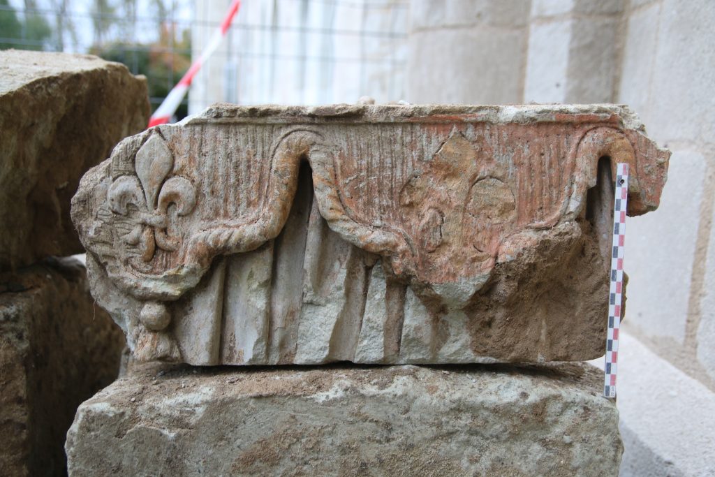 Un autre volet du travail de post-fouille sera consacré à l’étude des éléments de lapidaire découverts en remploi dans les anciens contreforts. La modélisation en volumétrie du soubassement du retable et l’analyse des tracés d’épure relevés sur les blocs encore en place permettront éventuellement de remettre à leur place dans le monument les différents éléments du corpus.