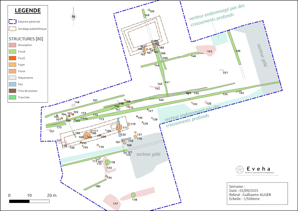 L’opération archéologique a permis l’identification de 98 faits au total, dont 80 structures ou unités stratigraphiques retenues. Ces découvertes couvrent une vaste chronologie, s’étendant du Paléolithique Moyen à l’Antiquité. La fouille se situait dans un contexte de pollution des sols qui a nécessité la mise en place d’un protocole strict afin d’assurer la sécurité des archéologues (port de combinaisons et de masques, gants…).