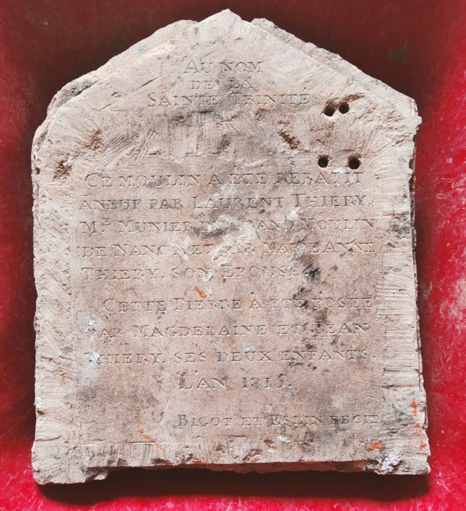 La découverte dans les remblais de démolition de la grande cave voûtée d’une plaque commémorative permet d’affirmer qu’en 1815, le nouveau moulin est en fonction. Celui-ci est un moulin à roue verticale située contre la façade occidentale de l’usine hydraulique. Seul moulin à eau de la commune de Jarville-la-Malgrange, il a fonctionné de 1815 à 1897, date à laquelle le site meunier est transformé en ferme. Au nord-ouest, un grand bâtiment rectangulaire vient s’appuyer contre l’ancien moulin. Orienté est-ouest, ce hangar figure sur les plans anciens de la propriété de M. Goüy de Bellocq. On remarque que la roue a disparu. Seuls des fragments de meule en grès rose des Vosges ont été mis au jour. Ils ont été découverts en remploi dans des murs formant une petite pièce au sud-est du moulin.