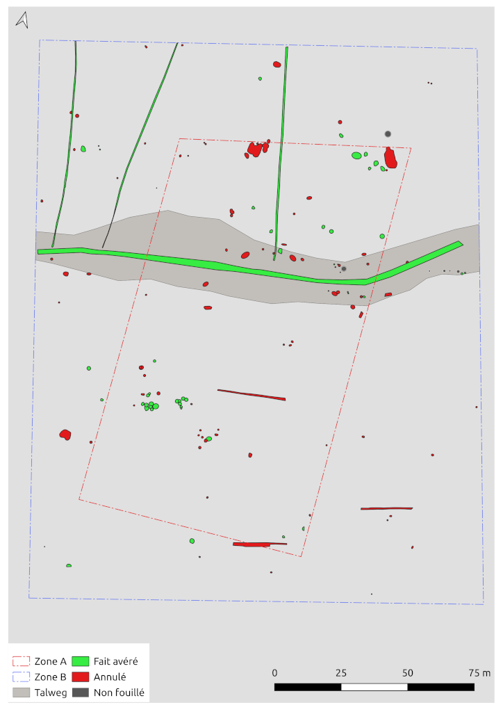 3,5 ha ouverts par l’opération. Ces découvertes permettent de confirmer une présence humaine dans ce secteur au cours de ces périodes, mais elles n’ont pas permis de mettre en évidence une occupation particulière.
