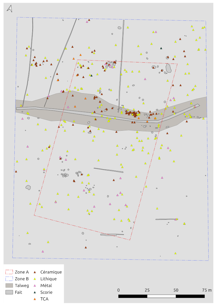 Entre ces deux pôles, en bordure nord du talweg, une importante concentration de matériel céramique, contenu dans ce qui semble être un niveau de colluvionnement, se distingue. À proximité de cette concentration, quelques structures pouvant être interprétées comme des trous de poteau ont également été découvertes. Si les structures d’habitat de cette occupation du premier âge du Fer n’ont pas pu être découvertes, ces derniers éléments sont des indices permettant d’émettre l’hypothèse de l’installation de ce même habitat dans ce secteur, d’autant plus qu’il se situe à proximité d’un point d’eau constitué par le talweg.