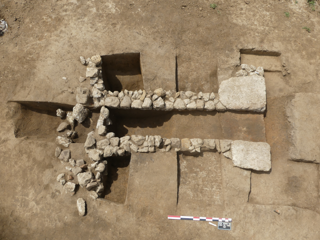 Une cave quadrangulaire aux murs maçonnés en calcaire (blocs équarris, liés avec du limon brun) a été fouillée, révélant des traces d’outils et un sol mal conservé.