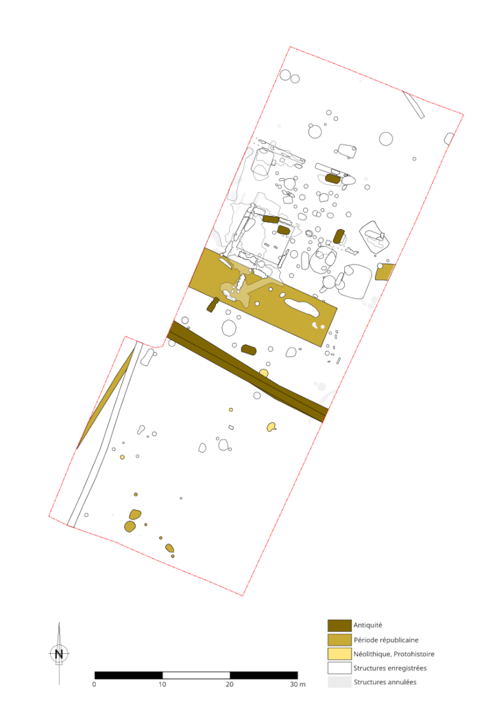 Des aménagements ont été rattachés à l’Antiquité (-25 av. J.-C. à 476 ap. J.-C.) en s’appuyant sur la chronologie relative et la présence de tuiles et de briques, mais leur datation demande à être précisée par l’étude du mobilier archéologique. Ces vestiges se répartissent dans la moitié nord de l’emprise de fouille et comprennent principalement un fossé d’orientation est-ouest découvert lors du diagnostic archéologique. Large et muni d’un fond plat, il résulterait de la modification d’un chenal initialement naturel. Au nord, ont été observées plusieurs fosses oblongues de fonction indéterminée, remplies d’éclats de pierres et de tuiles.