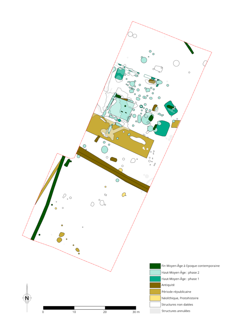 2720 m², des niveaux archéologiques s’échelonnant du Néolithique (6000-2300 av. J.-C.) à l’époque contemporaine. Les vestiges les plus denses sont associés au Haut Moyen Âge (476-1000 ap. J.-C.).