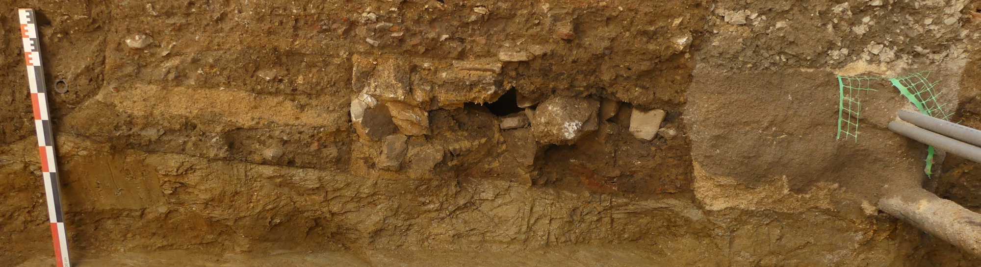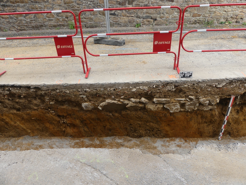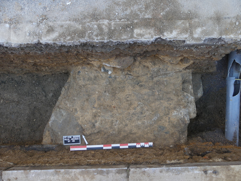 Lors du suivi effectué dans le centre-ville de Saint-Junien, quelques vestiges ont pu être rattachés à la période médiévale. En effet, en traversant la rue Camélinat, l’ancien rempart de la ville est apparu partiellement (Fig. 1). Construit avec des pierres de granite, sa largeur conservée avoisine 1,70 m, la partie orientale étant recoupée par un réseau d’eaux usées. Une semelle de fondation a pu être observée, servant d’appui aux premiers lits de pierre en élévation. Le liant utilisé correspond à un mortier très sableux de couleur jaune, très faiblement chargé en chaux, pouvant indiquer une faible qualité de construction. En association avec le rempart et situé à 2,70 m vers l’ouest du parement occidental, un fossé a été légèrement dégagé, ce qui a permis de découvrir sa largeur maximale, entre 12,50 m et 14 m. Seul le comblement supérieur a pu en être exploré avant que la côte de fond des travaux n’ait été atteinte. Ces deux éléments permettaient la défense passive de la ville au Moyen Âge puis pendant les guerres de Religion à l’Époque moderne.