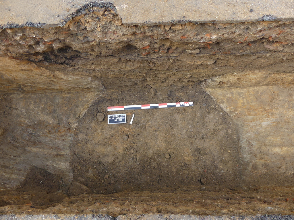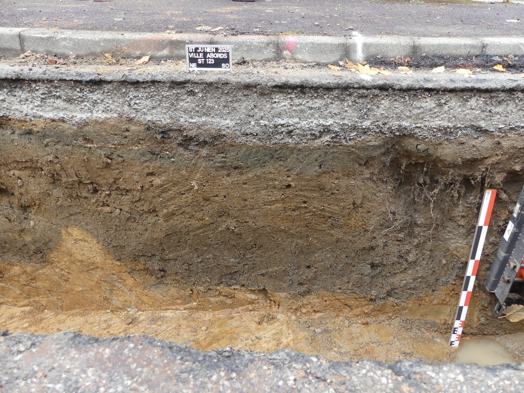 La rue située au nord de la Place Lacôte témoigne de l’implantation de fosse à arbres à cette époque. De nombreuses fosses de grande envergure ont été traversées, présentant un faciès et des caractéristiques de comblements similaires (Fig. 7). Il est possible de rattacher l’implantation de ces structures aux travaux engagés pour la création du boulevard de la République, autour de l’ancienne enceinte urbaine de la ville de Saint-Junien à la fin du 18e s. et à la première moitié du 19e s. Au niveau de l’intersection entre la rue Lacôte et le boulevard Sadi Carnot, des rails de l’ancienne ligne départementale n° 3 du tramway Limoges / Bussière-Poitevine, utilisée entre 1911 et 1946, ont été observés, illustrant les aménagements ferroviaires du début du siècle dernier.