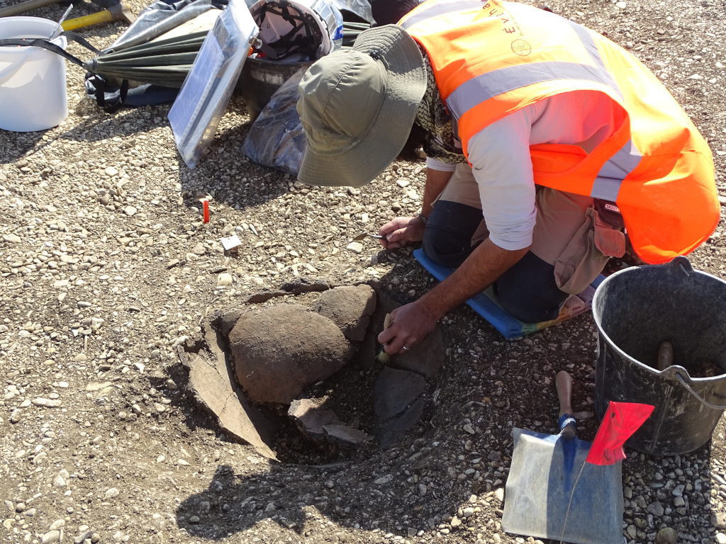 Fig.6 : Vase de stockage en cours de fouille. Crédit : Éveha, 2025.