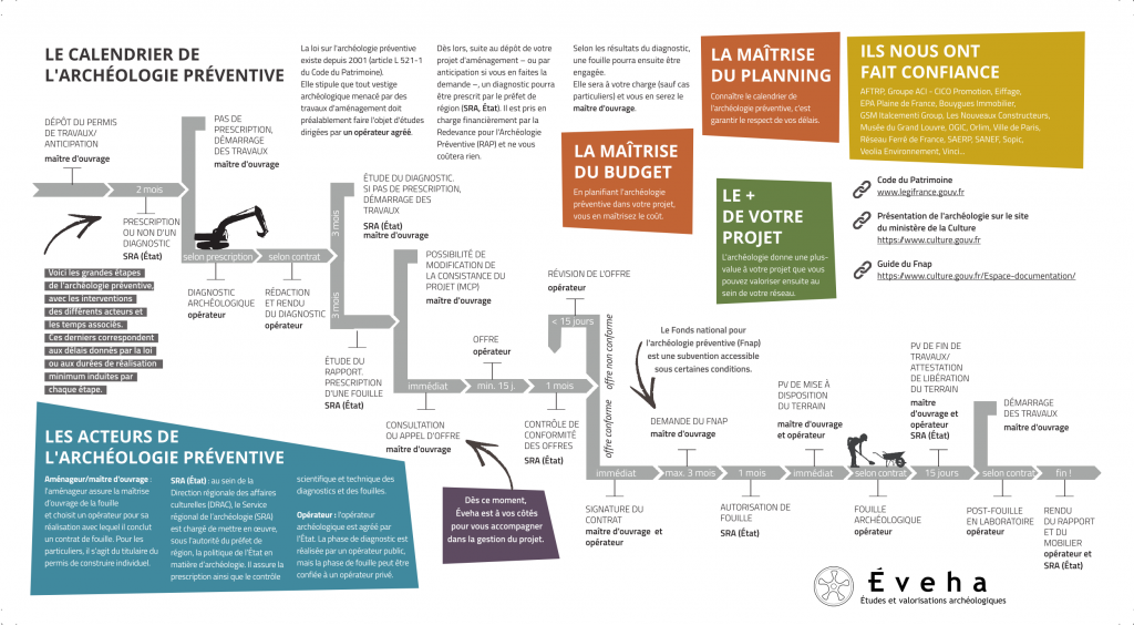 Depuis sa création, Éveha a réalisé plus de 1000 opérations archéologiques pour de grandes entreprises, des établissements publics, des collectivités territoriales et des groupements d’intérêt économique.